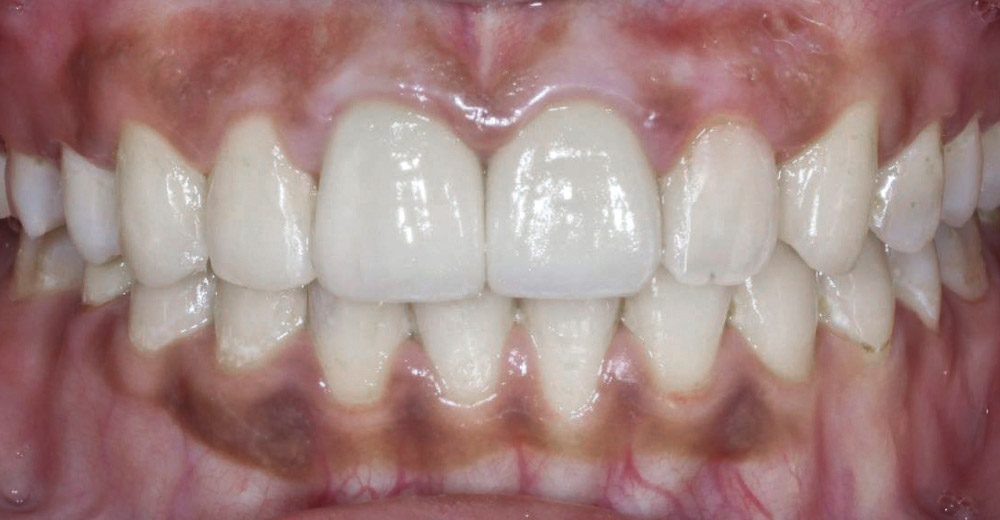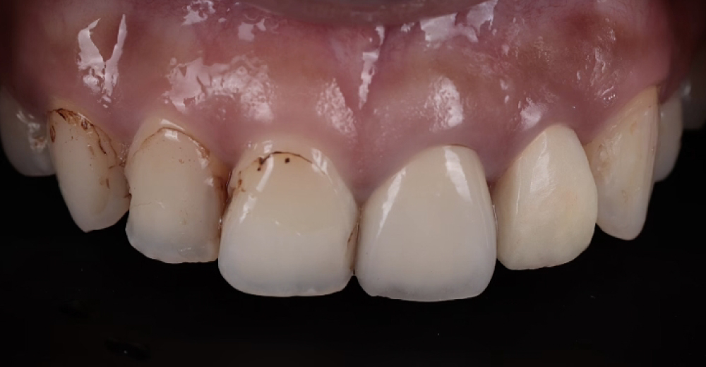 患者原有牙齒牙肉高低不齊、齒色暗黃、齒形不對稱、門牙黑三角等問題,除了透過水雷射牙齦整形調整牙肉高度外,採用 全瓷美白貼片,以 DSD 數位微笑設計 (Digital Smile Design) 的方式進行客製化微笑曲線設計。