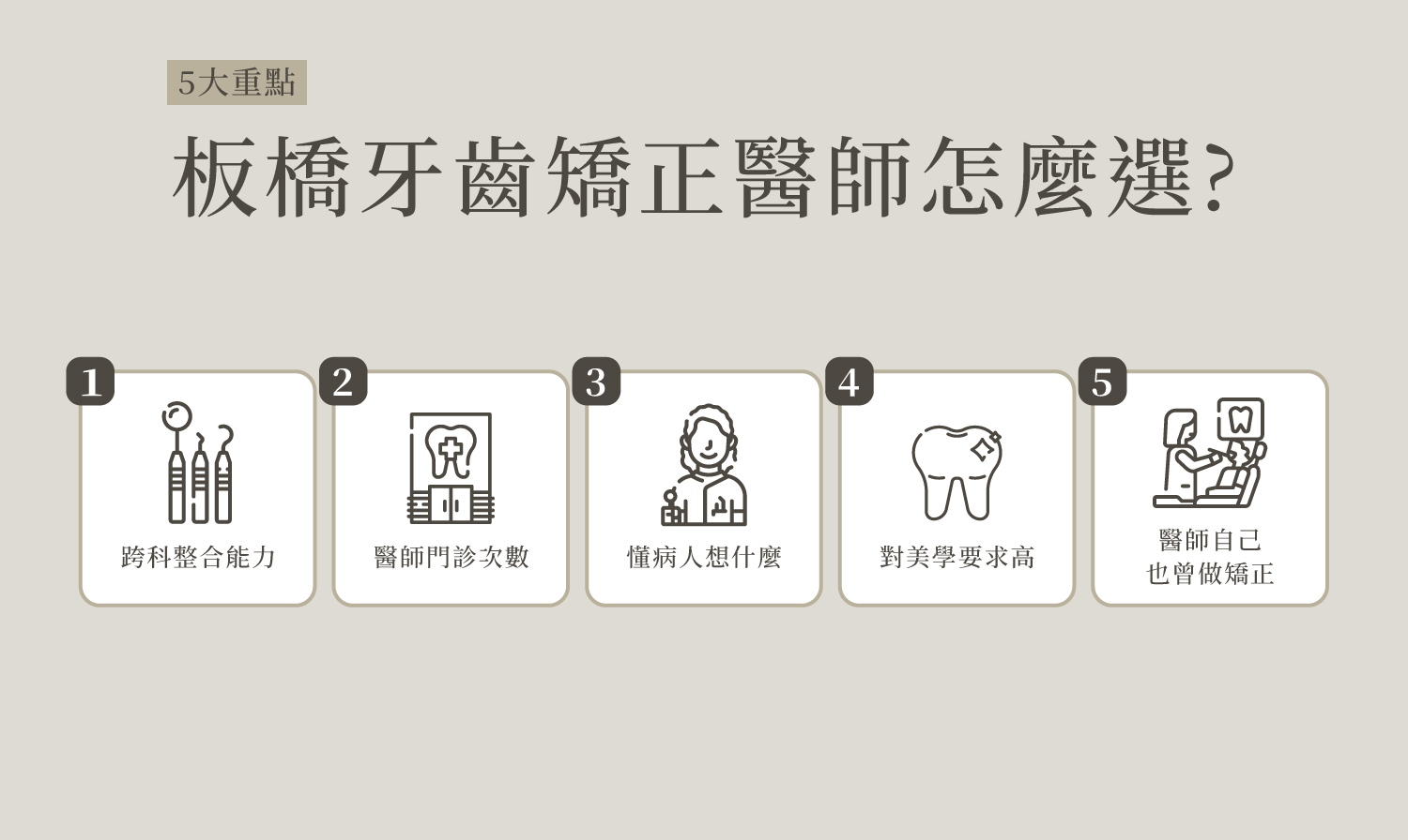 路上矯正診所琳瑯滿目,要怎麼找到適合自己的矯正牙醫,除了透過醫生資歷、診所環境、醫療設備等基本條件篩選外,另外也整理臨床執業時觀察到的5大挑選重點,這些都是患者來到診所非常在意的,希望幫助大家找到合適的矯正牙醫!