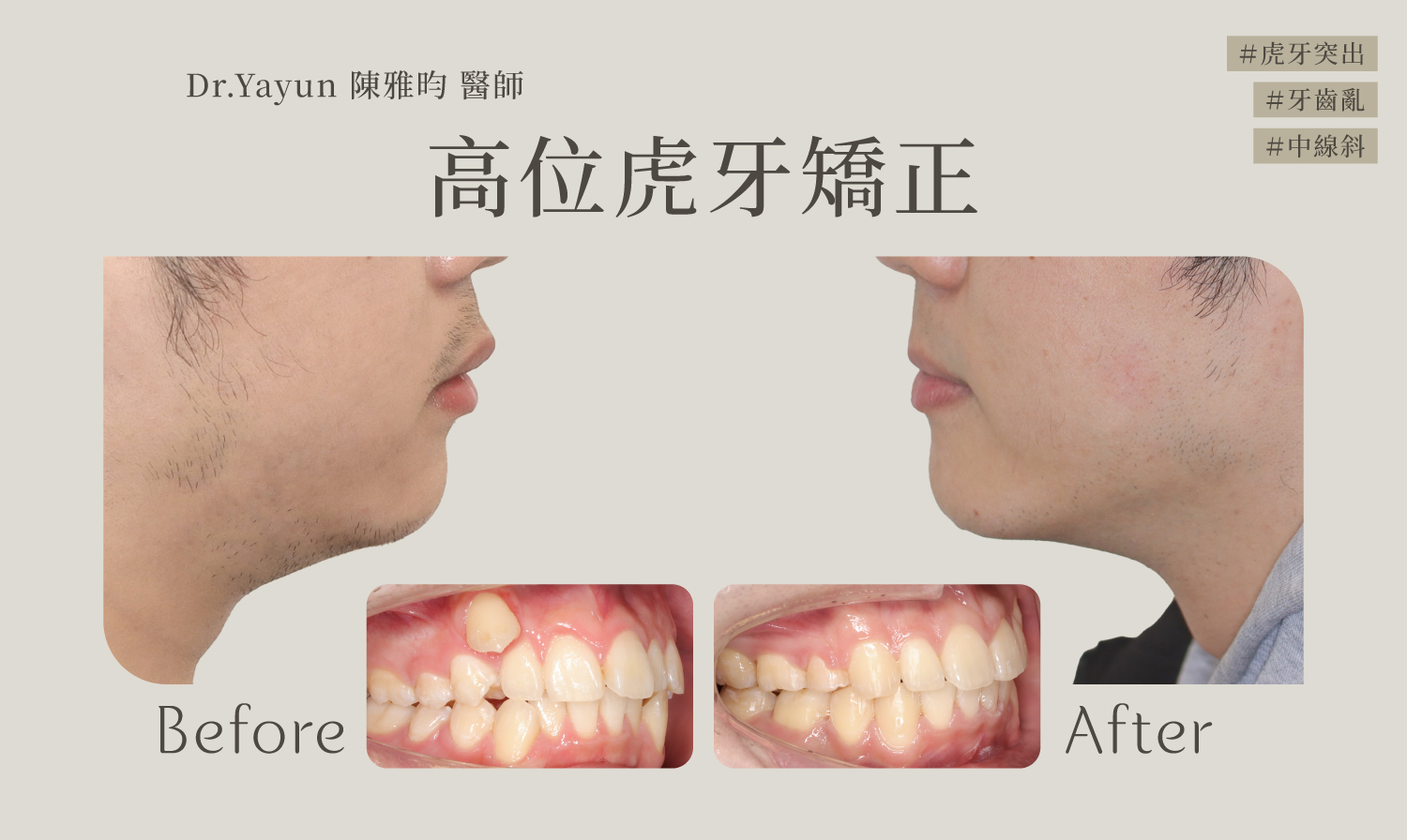 虎牙雖然看著可愛,但會有難清潔、容易蛀牙的風險,病人因牙齒亂、虎牙、中線嚴重歪斜等問題到日煦就診,經陳醫師評估、討論後,決定採用自鎖式矯正器,陳醫師先將虎牙後方不利清潔、蛀牙的小臼齒移除,再透過這個空間把卡在外側的虎牙下拉、排列整齊,而原本歪斜的中線也移到正確位置上,完成矯正後不僅中線對正,後縮的下巴前拉,臉型更立體、笑容更自信,整齊牙齒也更利於清潔,降低蛀牙風險。