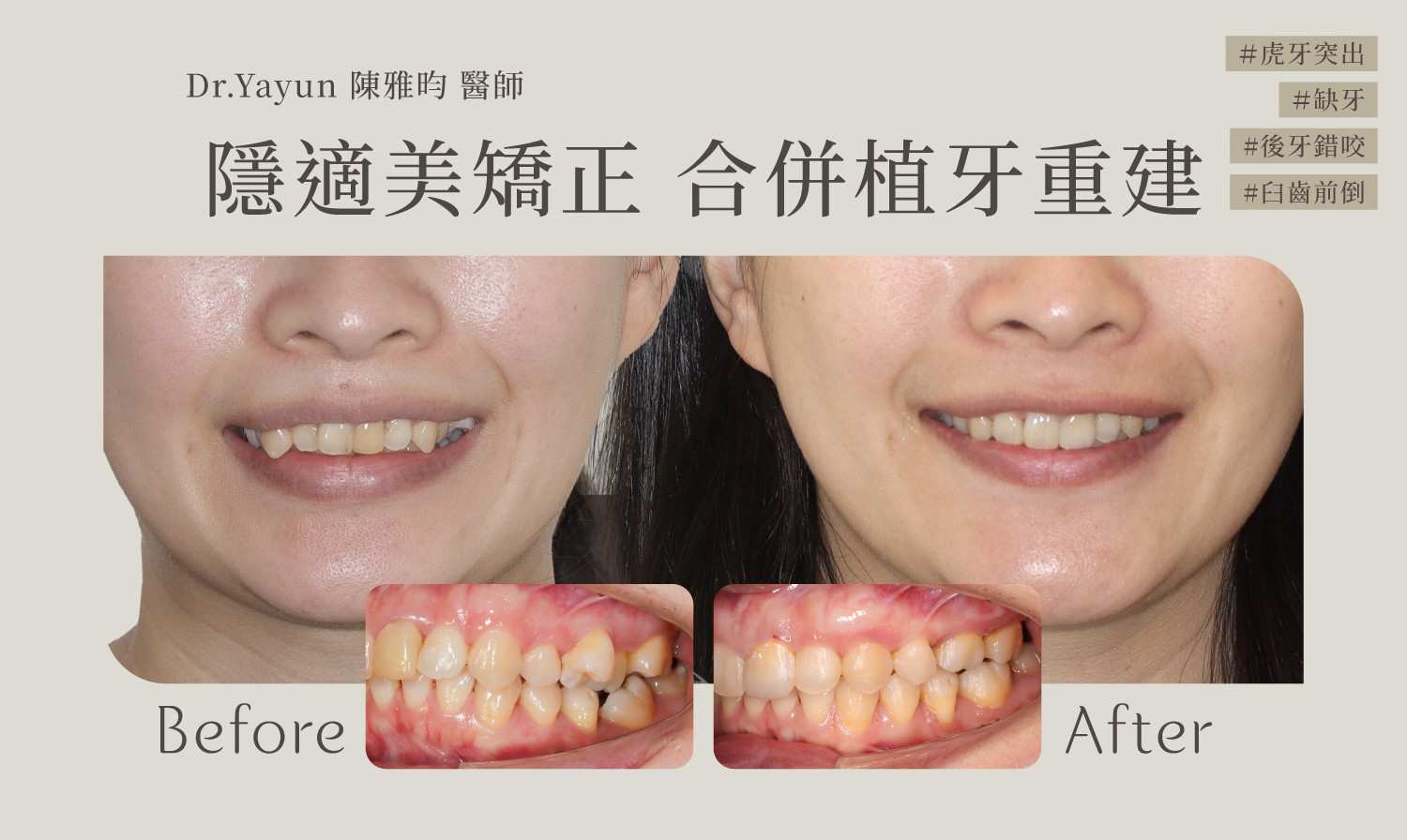 於是在評估分析、了解病人美觀需求後,我們決定採用隱適美矯正,將牙齒排整齊、改善虎牙和錯咬問題,並同時將往前倒的後牙排正,左側關閉缺牙牙縫、右側單顆植牙,重建後牙穩定咬合。