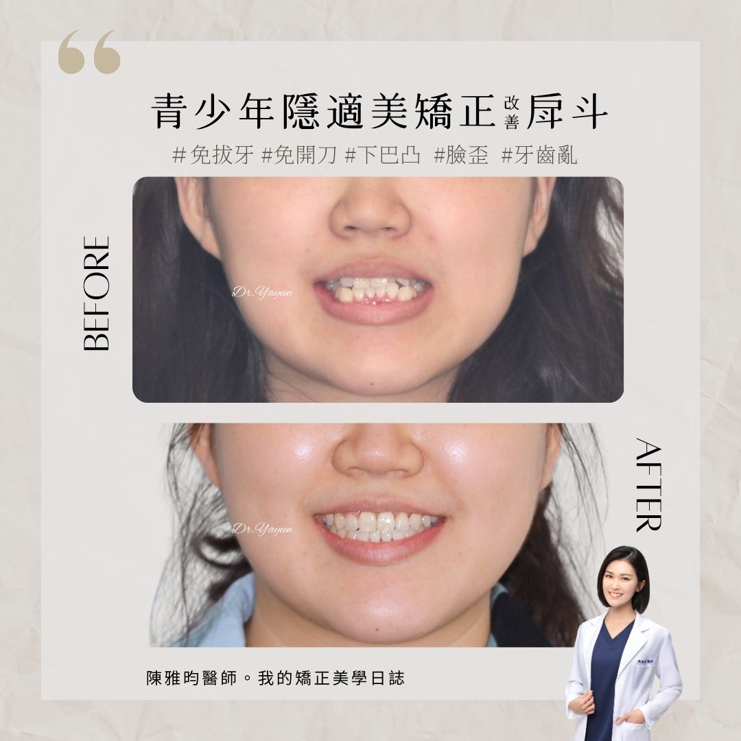 她的媽媽陪她一起來諮詢時,也坦言:「妹妹的牙齒很亂,從小就不太敢大笑,而且側面看起來有點像「月亮臉」,再加上牙齒擁擠、清潔不易,讓她笑起來更不自在。」