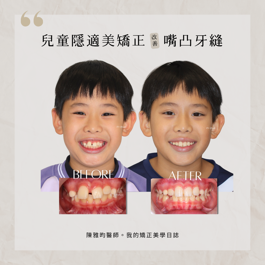 這位 9 歲的小男孩天生活潑健談,卻因為 大門牙歪斜、牙縫過大,導致: