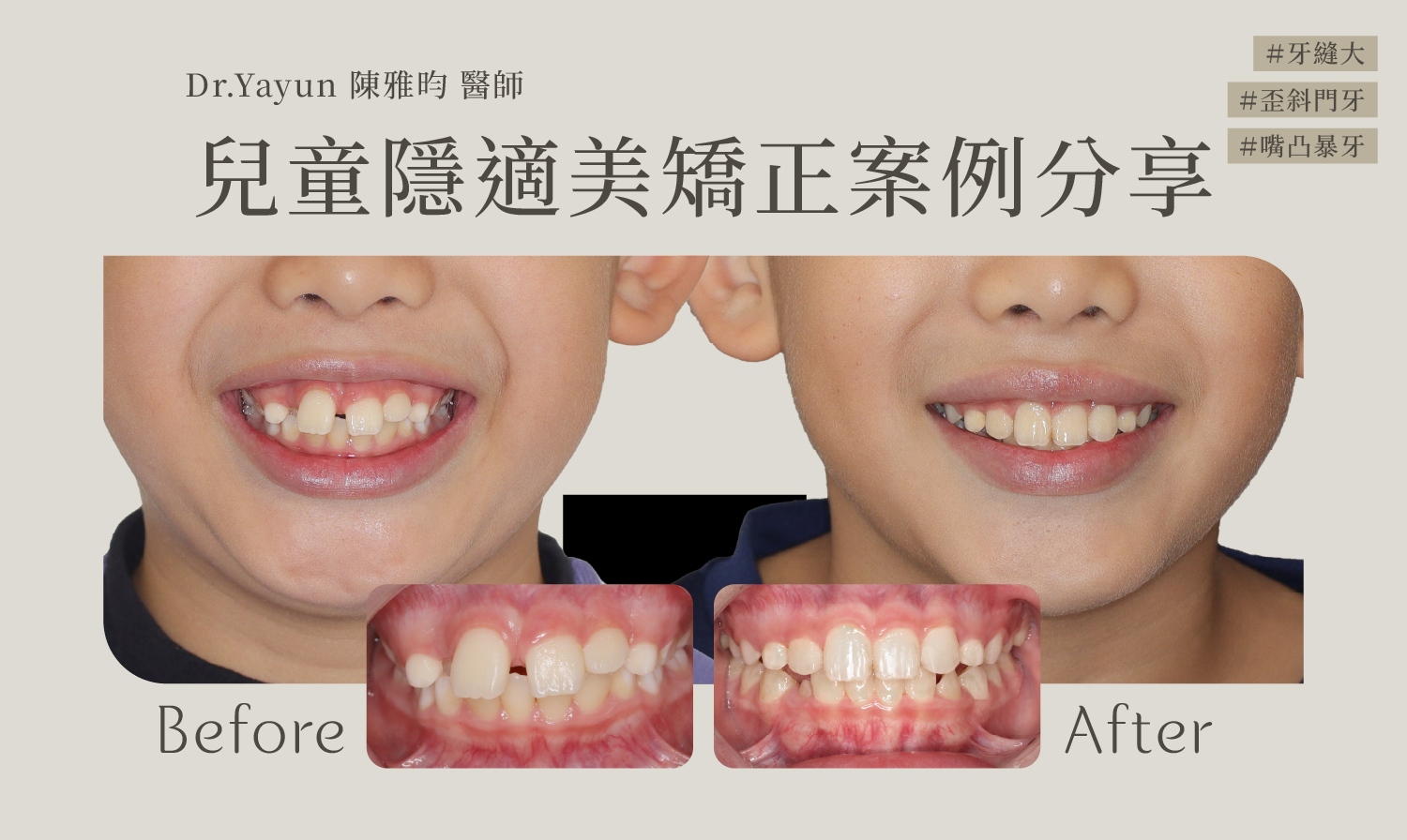 陳醫師和家長討論後決定採用兒童隱適美Invisalign First,針對小朋友狀況進行早期矯正,重點放在拉回上排門牙、改善嘴凸與深咬問題,並撐寬牙弓,預留空間讓未萌發的恆牙能夠順利長出,同時引導下顎前移生長,改善下巴後縮、嘴凸等臉型問題,療程不到1.5年就完成,小朋友從臉型到咬合一次改變,不僅前牙可以輕鬆咬斷食物,笑容也變得更加有自信。