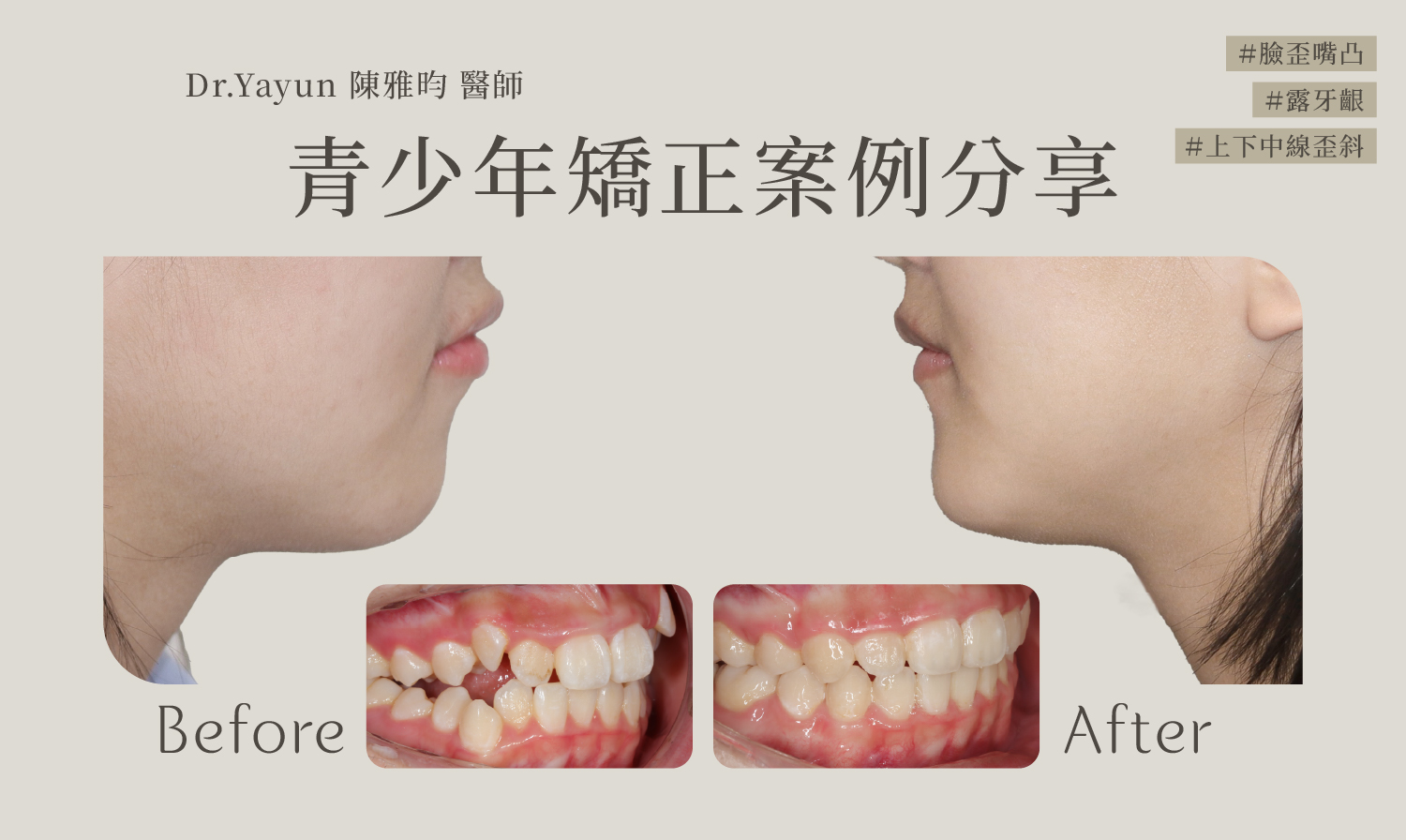 這名女高中生因牙齒亂、下巴歪斜、笑容露牙齦,不僅對於外貌感到自卑外,還有咀嚼不順、容易卡垢等口腔問題,媽媽帶著女兒看過不少醫師,都被建議成年後再進行正顎手術改善,因身邊親友介紹才來找陳醫師諮詢評估。