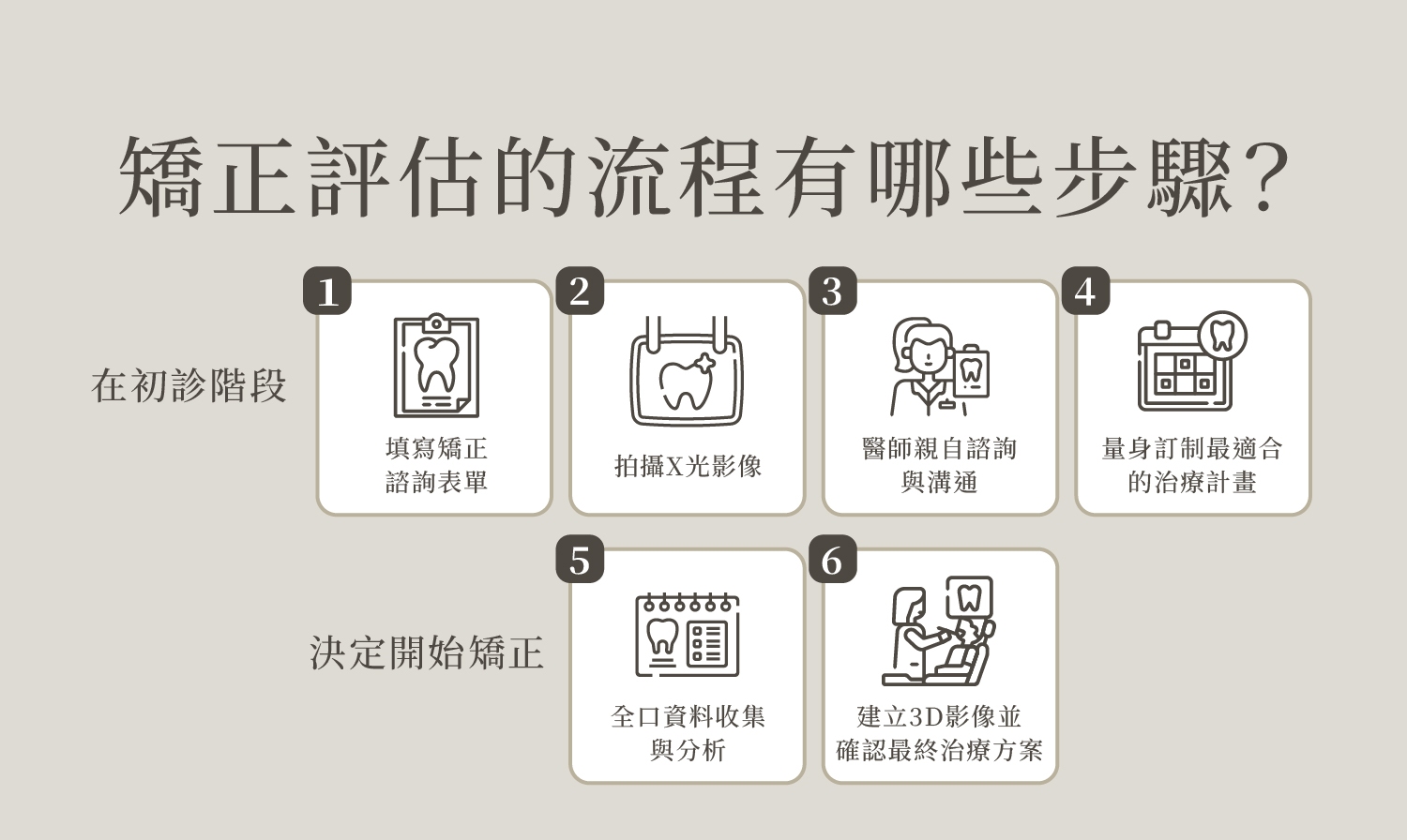 下定決心想要進行矯正,一定要先經過牙醫評估,主要是因為每個人的牙齒狀況,以及需要矯正的目標都不盡相同,所以事前醫師會蒐集你的牙齒、骨骼、笑容等相關資料,再和你聊一聊最在意的問題,逐一整合後,才能就哪裡需要調整、如何調整和可行性進行討論,最終達成彼此都滿意的矯正目標,而且現在矯正技術發達,還能透過3D模擬預見未來矯正完成的樣子!
